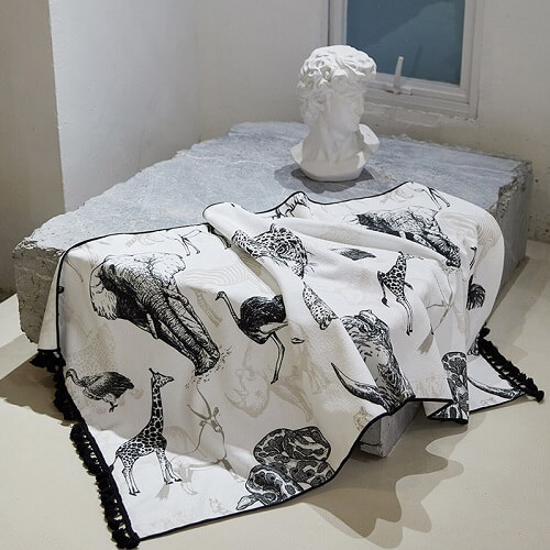 Decorative pillows, throws, area rugs, doormats, decorative storage, chair pads, tablecloths, lanterns, baskets, decorative objects.